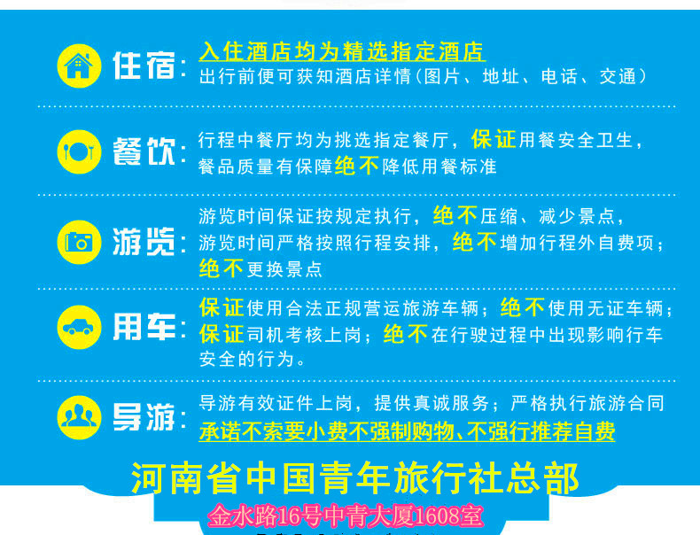 线路一: 第1天行程 早餐后赴焦作(约120分钟),游览世界地质公园【云台山景区】(参观约5个小时):有“潭瀑苑”之称的【小寨沟】(情人沟、丫字瀑、水帘洞、不老泉、龙凤壁等),小寨沟三步一泉、五步一瀑、十步一潭,似跳动的音乐,流动的画卷;游览落差居亚洲之冠的云台天瀑【泉瀑峡】(老潭沟),游览“峡谷极品”【红石峡】(温盘峪) 第2天行程 赴登封(约1个小时)游览中国最早的佛教禅宗祖庭、武术之源—【少林寺】(参观时间约160分钟):【常住院】、【塔林】、观看【武术表演】(随缘),车览中岳嵩山风光,中餐后赴洛阳(约1个小时)参观世界文化遗产—【龙门石窟】(参观时间约160分钟):潜溪寺、宾阳三洞、万佛洞、莲花洞、奉先寺等,欣赏伊洛河风光,车观洛阳老城-丽京门,晚可自费品尝神州第一宴、洛阳特色风味餐—洛阳水席(780元/桌起,自费自愿) 第3天行程 汽车赴开封(约60分钟),车穿七朝古都西门【大梁门】,参观北宋开封首府—【开封府】(参观约60分钟):真切体会“游开封府,品味大宋文化;拜包龙图,领略人间正气”,车游仿古一条街—宋都御街,参观开封标志性建筑—【铁塔】(约40分钟),中餐后返程或返郑州游览花园口黄河游览区,返郑州,二七广场、市容,后送团,结束愉快行程! 线路二: 第1天行程 导游接团后乘旅游空调车赴中华武术之乡—登封(70公里高速,约1个小时),沿途欣赏嵩山风光,参观中国武术发源地、佛教禅宗组庭—【少林寺】(150分钟),观常驻院、少林寺历代高僧的墓园—塔林、看中华一绝—武术表演(随缘),后赴九朝古都-洛阳,参观世界文化遗产——【龙门石窟】(120分钟)、远观唐朝著名诗人白居易的墓园—白园、中原十大名寺之—香山寺,欣赏伊洛河风光 第2天行程 早餐后乘车赴世界地质公园、国家5A级景区【云台山风景名胜区】(120公里高速,约2小时);参观游览峡谷 极品—“盆景峡谷”【红石峡景区】(90分钟),欣赏丹山碧水奇特自然山水风光,太行山绝无仅有地质景观。游 览誉有北方小九寨美称【潭瀑峡】(120分钟),欣赏三步一潭、五步一瀑秀美自然景观;泉瀑峡(游览约100 分)可观亚洲落差最大的云台天瀑(焦作地方土特产(约40分),后乘车返郑州。 第3天行程 早餐后乘车穿过【叠彩洞】,游览云台山的最高峰—【茱萸峰】(游览时间约120分钟),我国古代著名诗人王维层在这里留下了“独在异乡为异客,每逢佳节倍思亲”这一千古绝唱,后车赴六朝古都--开封(车程约2.5个小时)车览大梁门,遥望古城墙,后入住酒店。 含早餐 住宿:郑州 D4:早出发赴开封游中国历史文化名城开封,游宋代清官包拯纪念地【包公祠】(约40分钟),天下第一塔----【铁塔】(约50分钟),游览以北宋著名画家张择端的传世名作《清明上河图》为蓝本修建的仿宋大型主题公园----【清明上河园】(约150分钟),杨家湖,潘家湖,宋都御街。返郑途中,好想你枣店自由选购河南地方特产(约40分钟),下午6:00左右返回郑州,入住酒店。 含早餐 线路三: 第1天行程 郑州接团后车赴七朝古都开封,车游开封西城门—大梁门,遥望古城墙,参观北宋最大最完整的府衙建筑群、天下首府【开封府】(游览时间约1小时),真切地体会到“游开封府,品味大宋文化;拜包龙图,领略人间正气”。车览仿宋一条街——宋都御街,潘家湖、杨家湖;后参观【大相国寺】(游览时间约1 小时)是我国汉传佛教十大名寺之一,被称为我国历史上第一座“为国开堂”的“皇家寺院”。晚餐可在“开封第一楼”或“皇家包子”品尝当地正宗的特色灌汤包子宴(它用料考究,制艺精湛,具有皮薄馅大、灌汤流油、软嫩鲜香、肥而不腻的特点和提起象灯笼、放下似菊花的优美外形,被誉为“中州膳食一绝”)后赴郑州入住(车程约1小时)。 第2天行程 早餐可品尝“方中山”胡辣汤,餐后乘车赴世界地质公园、国家5A级景区-【云台山风景名胜区】(车程约2.5小时)参观游览峡谷极品—“盆景峡谷”红石峡景区(游览时间约90分钟),欣赏丹山碧水奇特自然山水风光,太行山绝无仅有地质景观。中餐后二次进山参观游览誉有北方小九寨美称-【潭瀑峡】(游览时间约100分钟),自由游览猕猴谷,晚餐可在“老董家”品尝特色怀庆府驴肉宴(老董家驴肉传承了300年的文化积淀,第八代传人现在已经推出百余道菜肴,已完善了以驴肉制作的全驴宴,致力要让来过焦作的人吃到老董家驴肉,都会赞不绝口)。 第3天行程 早餐后乘车赴巩义(车程约1.5小时),参观【康百万庄园】(游览约2小时)始建于明末清初,因而有“金龟探水”的美称,是全国三大庄园(刘文康百万庄园彩庄园、牟二黑庄园)之一。被誉为豫商精神家园,中原古建筑典范。集农、官、商为一体的大型地主庄园;它的石雕、木雕、砖雕,被誉为中原艺术的奇葩。中餐后乘车赴九朝古都洛阳,参观世界文化遗产—【龙门石窟】(游览约2小时,不含电瓶车12元/人),远观唐朝著名诗人白居易的墓园白园、中原十大名寺之—香山寺,晚餐可在洛阳百年老字号—“真不同”水席楼品尝唐朝宫廷宴席洛阳水席(已有百余年的历史的中华老字号企业,具有浓郁的河洛地方特色,深受广大消费者喜爱,民间有“不进真不同,未到洛阳城”之说)。 第4天行程 早餐可品尝倍受洛阳人喜欢的当地小吃牛/羊肉汤,后乘车赴武术之乡登封(车程约1.5小时),参观天下第一名刹、佛教禅宗组庭—【少林寺】(游览约150分,不含往返电瓶车20元